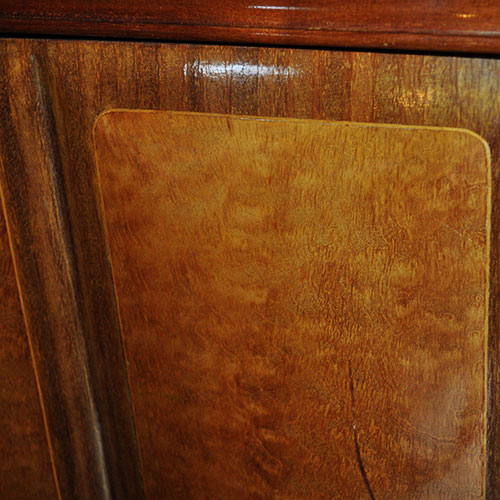 Caratteristiche: elegante credenza mobile bar stile Decò degli anni '30, caratterizzata da quattro ante di cui due sagomate che seguono il profilo dl mobile, due ad angolo con pianetti interni, due centrali di cui una rivestita internamente da vetri e specchi, usabile come mobile bar. Sostegni alti e sagomati, ante bombate e lastronate con una splendida radica di noce, piedini e decorazioni in ottone. Intarsio a filetto di rosa che delimita la radica sulle ante, illuminazione interna (non testata). Tutte le ante hanno la chiusura a chiave, cornice superiore sagomata. Mobile di grande presenza. |