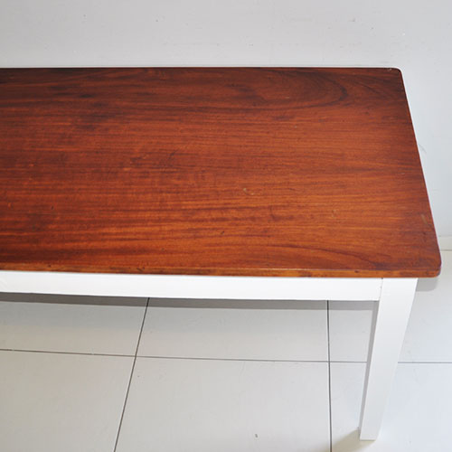 Caratteristiche: antico tavolo dei primi del '900 con struttura in castagno massello rivisitato a finitura bianca e piano in cilegio massello trattato a gommalacca per lasciare a vista tutte le sue bellissime venature. Cassetto centrale con maniglia a conchiglia, sostegni diritti e due allunghe in abete massello separate dalla struttura da usare al monento del bisogno che portano la sua lunghezza a 209 cm. Mobile di sicuro effetto e dalle ottime dimensioni, solido e resistente. |